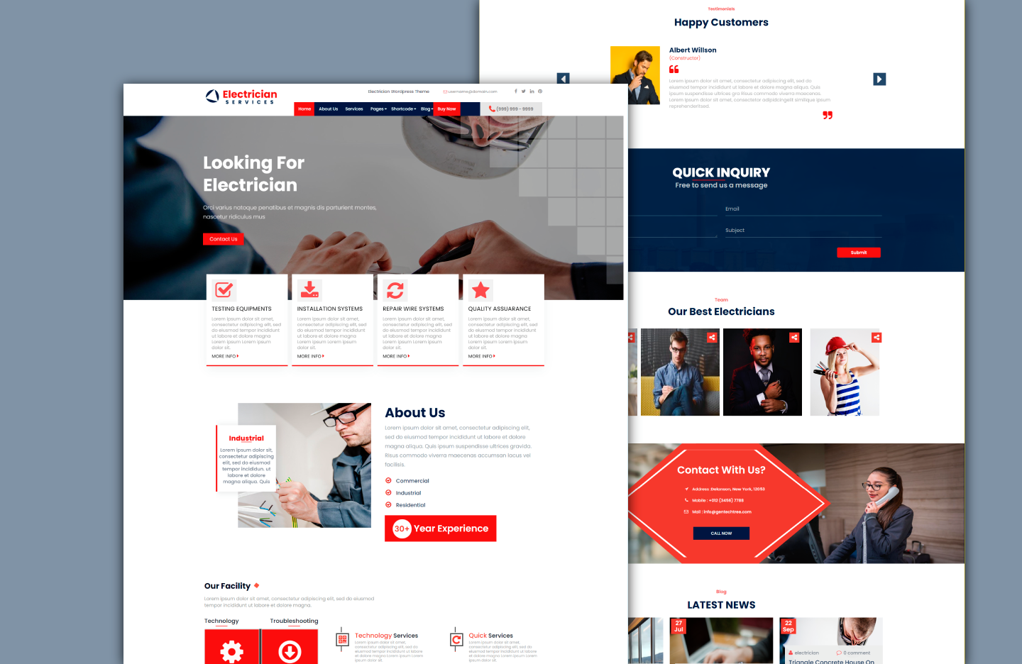 The Electrician WordPress Theme is a multipurpose website theme designed especially for electricians, electric fittings services, AC repair work, electrical company, electronics, technician, wireman, lineman and engineering, and electricity businesses. It is a clean as well as professional looking website design that perfectly suits services and products related to electronic businesses and electricians. It is a fully customizable ready-made website design with a user-friendly interface. With this theme and its customization features, you can build your own personalized electrician website exactly as you want without requiring any professional coding knowledge just with basic computer knowledge and with your creativity. The theme is created using the latest HTML5 and awesome CSS3 that provides an attractive user interface with clean, minimalistic and sophisticated homepage layouts and gives you a fine, modern and professional looking website.