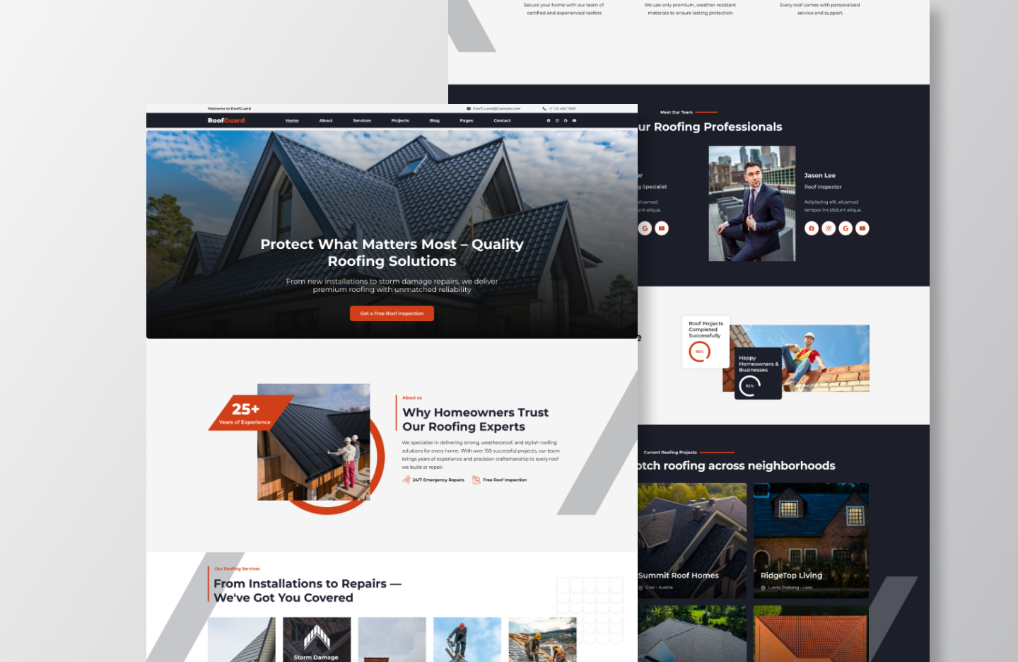 The Roofing WordPress Theme is a professional and modern solution tailored for roofing companies, construction businesses, contractors, roofing installation, roof repair service, metal roofing company, shingle roofing contractor, commercial roofing service, residential roofing expert, flat roof installer and renovation agencies. Crafted with a clean, minimal, and sophisticated layout, this theme allows businesses to showcase their services, past projects, and customer testimonials with stunning visual appeal. Its responsive and retina-ready design ensures seamless performance across all screen sizes, from desktops to mobile devices, providing a smooth user experience. Built on a Bootstrap framework with clean and optimized code, the Roofing WordPress Theme guarantees fast page load times and enhanced SEO performance. It includes essential elements like an eye-catching banner, interactive testimonial section, team showcase, and prominent call-to-action (CTA) buttons to convert visitors into leads.
